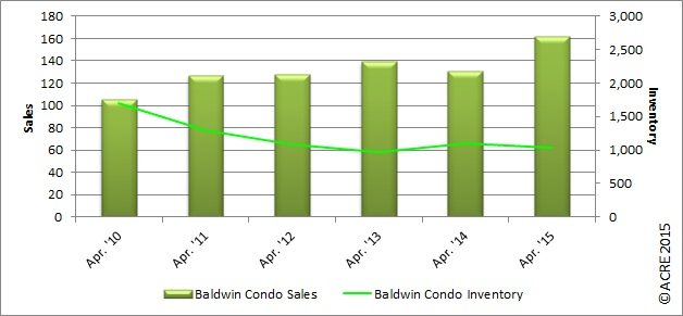 According to the Baldwin County Association of REALTORS MLS, Baldwin County condo sales, which include condos along the Gulf Coast, totaled 162 units in April. Sales improved 23.7 percent from the same period a year earlier. Year-to-date sales through April are 14.5 percent above 2014.