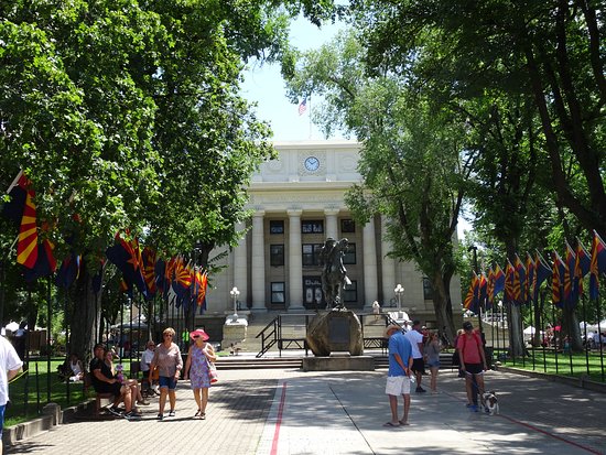Prescott is loved for it's small home town appeal and history. Wyatt Earp, Doc Holliday and his girlfriend, Big Nose Kate roamed the Palace Saloon on Whiskey Row in the late 1870's. The Palace opened in 1877 and still operates, making it the oldest business in Arizona. On July 14, 1900, a major fire struck Prescott, destroying five full city blocks, including most of Whiskey Row. It became known as "The Great Fire". The owner and the patrons of the bars helped load the bar and the liquid gold across the street onto the courthouse square, and continued drinking while the fire was being extingushed. The historic court house is surrounded by lush green grass and sidewalks making it a great place to cool off and walk around the square. Summer concerts and art festivals are enjoyed when permitted. Whiskey Row presently has several saloons, gift shops, candy, dress, jewelry shops and several really great restaurants. A town that has charm, history and most city amenties. Don't forget to bring your dog as we are very pet friendly!