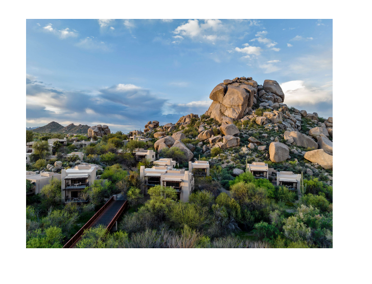 The Boulders is a famous resort golf spa surrounded by a large 3,700 home community. The resort is named for its massive boulder formations, said to be 12 million years old. This 1,300 acres includes over 770 single family homes on an average lot size of 50,000 square feet, with over half of the land natural untouched Sonoran desert vegetation. The Boulders are located on the Border of Scottsdale, in the small town of Carefree, near the well known Cave Creek Rodeo and Country Western shops and restaurants. Home sizes are modest with most under 3,000 square feet, and most favor the Santa Fe architectural style with massive wood beams on the ceilings. Residents have the opportunity to become members of the spa resort with two championship golf courses, one of the most popular spas in the Scottsdale Valley, tennis and pickleball. More