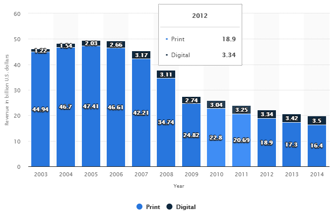 According to Statista, revenue from print advertisement has decreased drastically since 2007 and online advertising revenue has increased. While print advertisment is still alive a well, customers react quicker to online advertisement that allows a quick click to the item for sale.