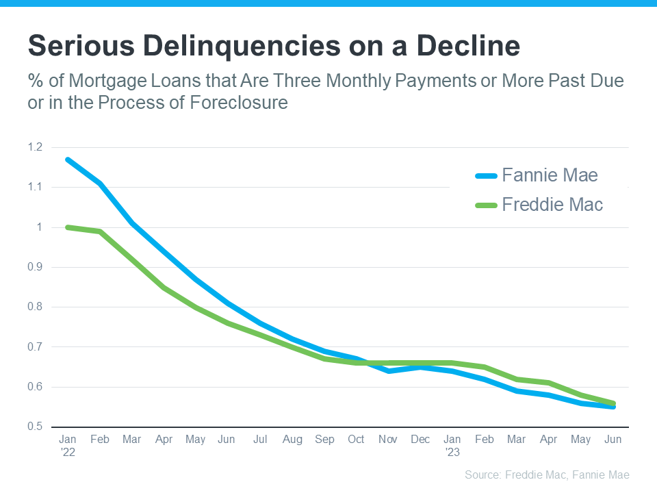 But now, lending standards have tightened, leading to more qualified buyers who can afford to make their mortgage payments. And data from Freddie Mac and Fannie Maeshows the number of homeowners who are seriously behind on their mortgage payments is declining (see graph below):