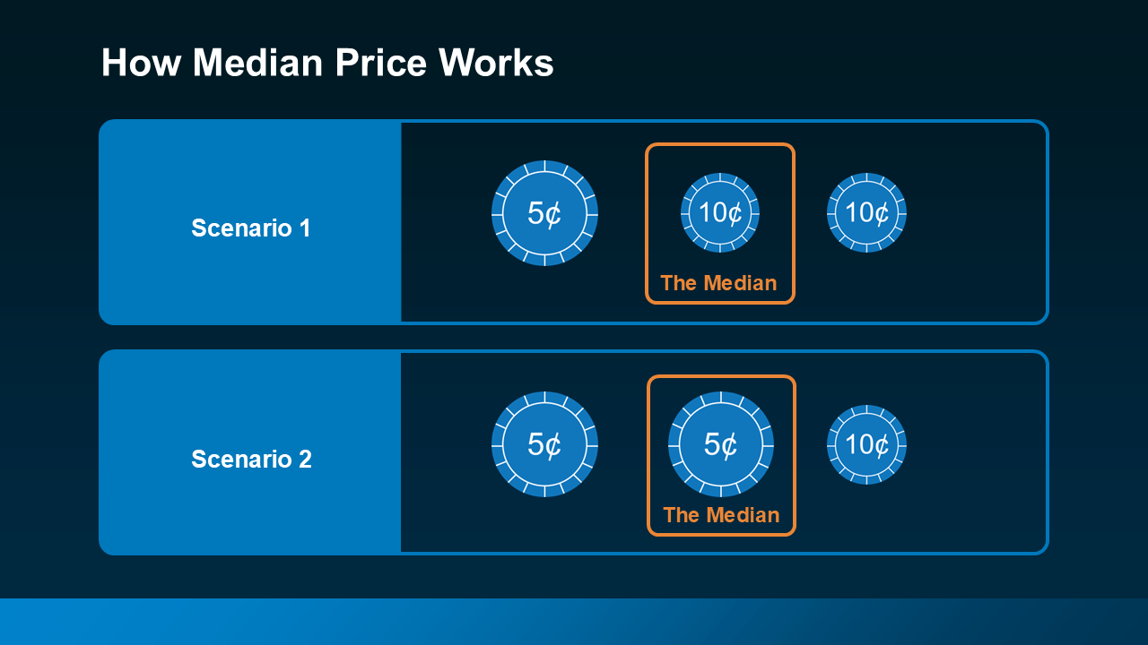 Let’s say you have three coins in your pocket, and you decide to line them up according to their value from low to high. If you have one nickel and two dimes, the median (the middle one) is 10 cents. If you have two nickels and one dime, the median is now five cents.