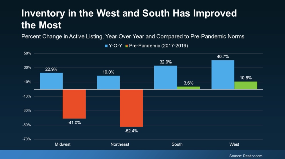 Nationally, the number of homes for sale is rising – and that’s true in all regions of the country. That’s shown in this data from Realtor.com. In each of the four regions, inventory is up at least 19% compared to the same time last year. In the West, it’s actually up almost 41% year-over-year (see graph below):