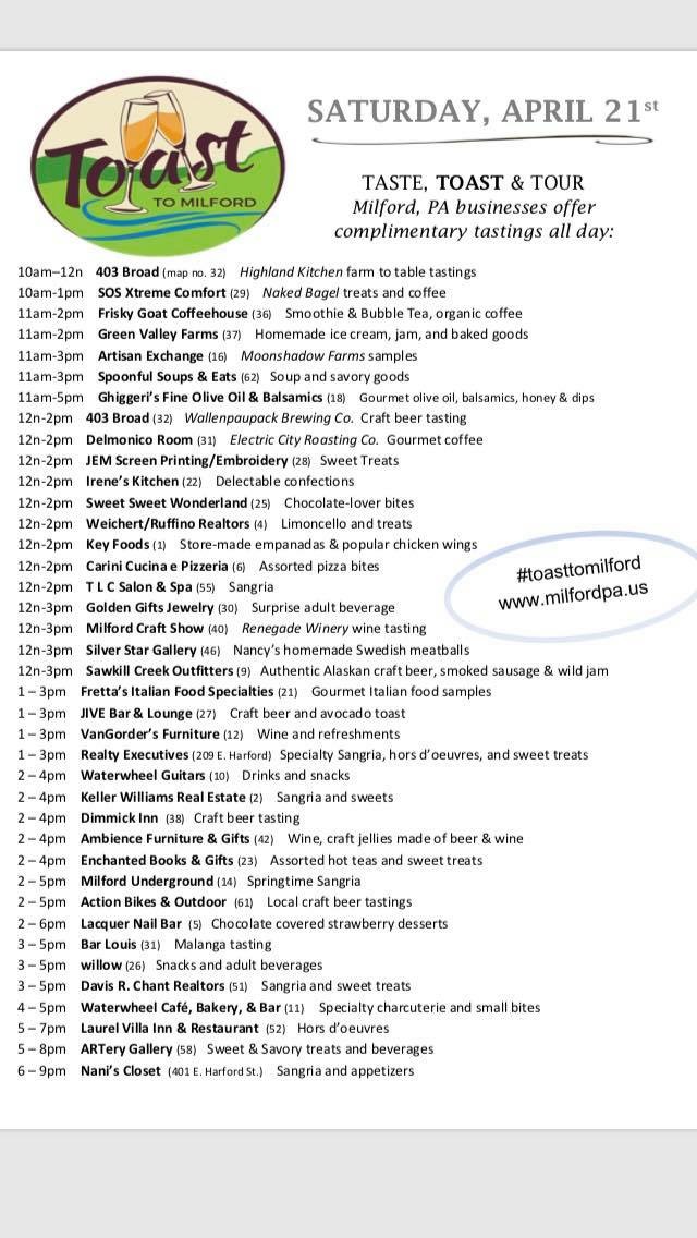 Looking for something to do on #Saturday? We are participating in the “Toast to Milford” from 1-3 at our new office location 209 E. Harford St. Whats better than walking around #Milford and having some free #food and #drinks? Hope you’ll stop by! Below is the full schedule with times & locations!