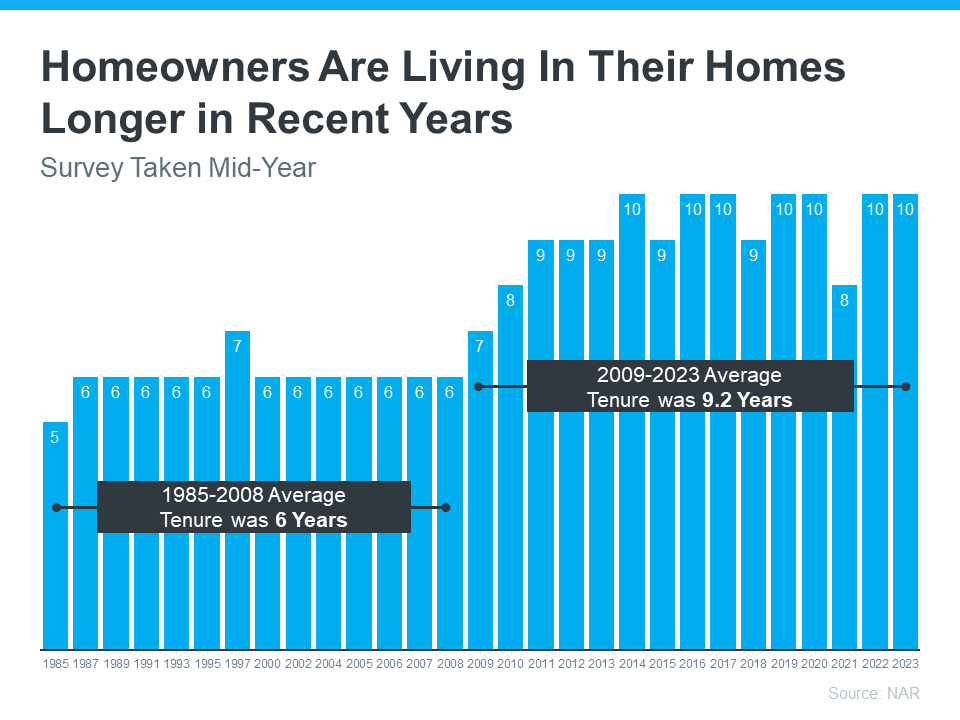 From 1985 to 2008, the average length of time homeowners typically stayed in their homes was only six years. But according to the National Association of Realtors (NAR), that number is rising today, meaning many homeowners are living in their houses even longer (see graph below):