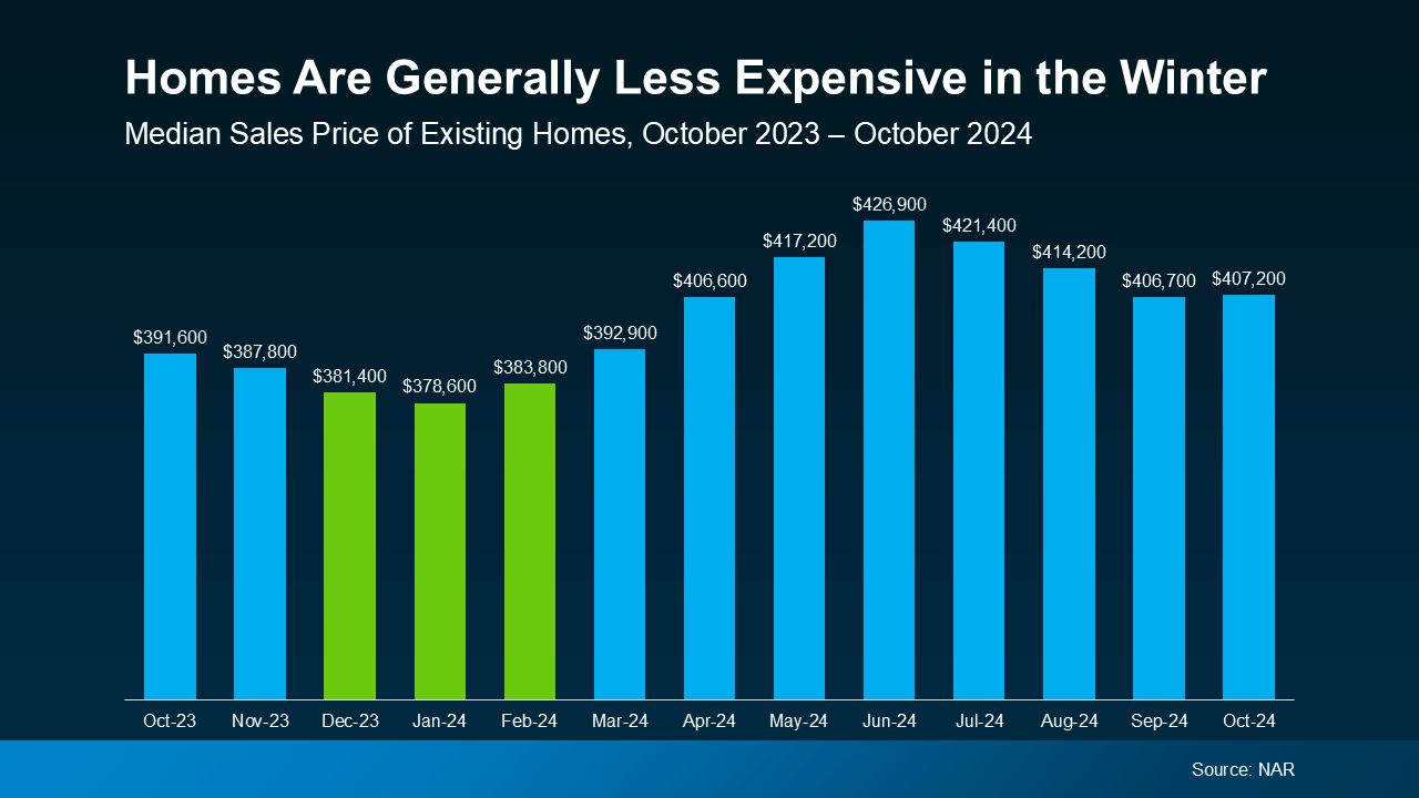 With less competition from other buyers and sellers who are more willing to negotiate, you may see slightly lower prices too. In fact, according to NAR, homes are typically about 5% less expensive now compared to when prices normally peak in the summer.