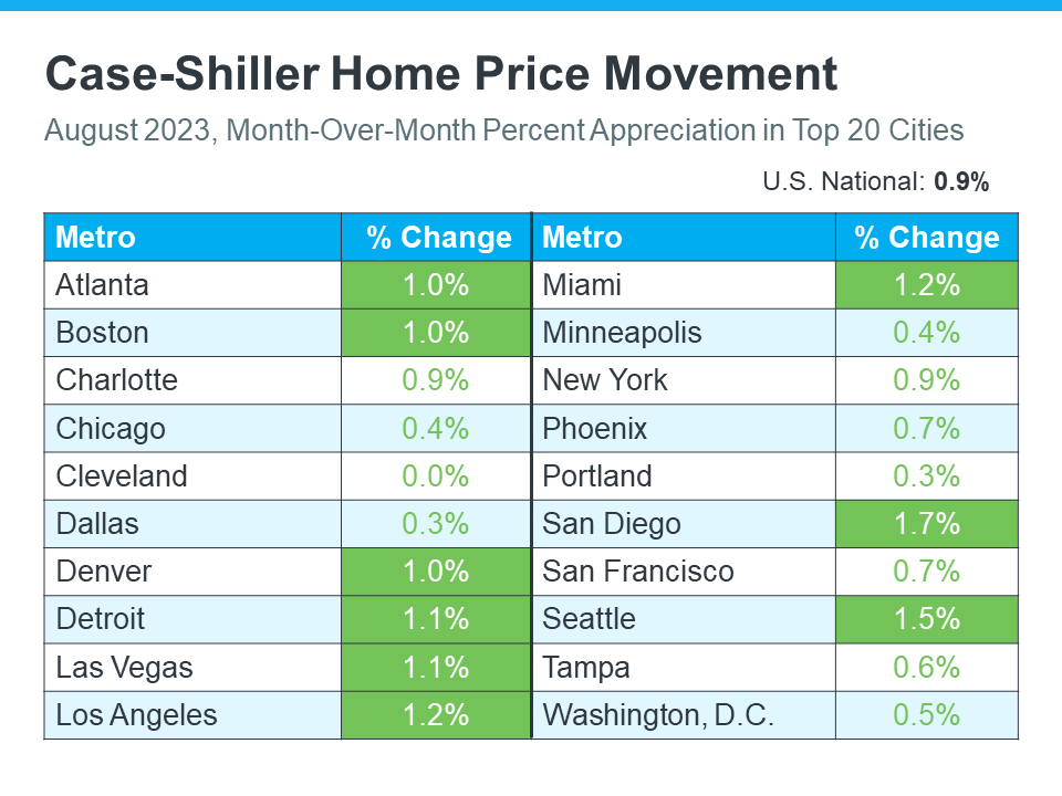 After seeing steady home price growth at the national level for the last several months, you may wonder if prices are going up in your local area, too. Know this: while this will vary from one area to the next, home prices are appreciating in these top cities Case-Shillerreports on in their monthly price index (see chart below):