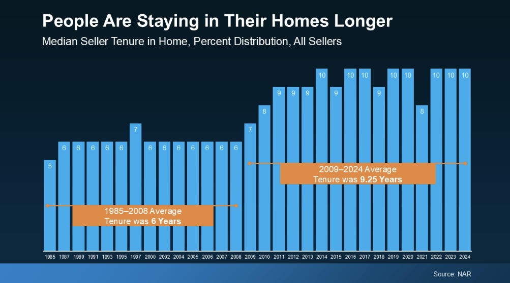 2. People Are Living in Their Homes Longer. Data from the National Association of Realtors (NAR), shows the average homeowner stays in their home for about 10 years now (see graph below):