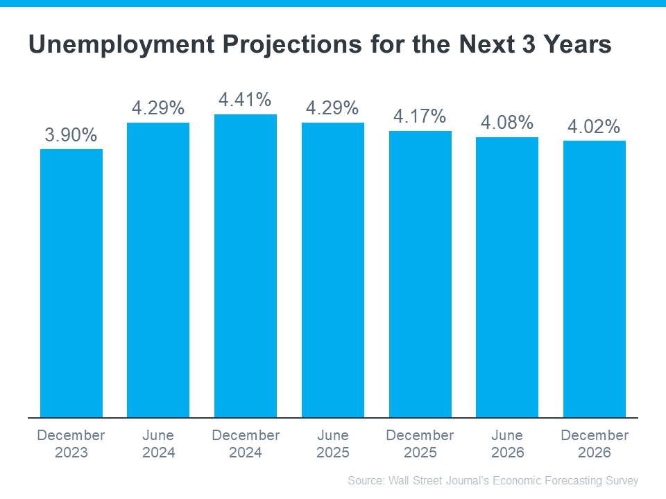If over half of the experts no longer expect a recession within the next year, you might naturally think those same experts also don’t expect the unemployment rate to jump way up – and you’d be right. The graph below uses data from that same WSJ survey to show exactly what the economists project for the unemployment rate over the next three years (see graph below):