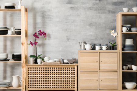 Renting a property does not have to mean you are limited in your décor and kitchen improvement choices. Things like peel-and-stick tiles and wall decals can add unique personality and intrigue to your rental property kitchen. Adhesive LED strips are also easy to install along the cabinet tops or bottoms to give the kitchen a modern look. Throw down a funky rug to cover dull tiles or worn floorboards or hang a set of café curtains to disguise a dull view. If you feel like the hardware is boring, swapping the handles and knobs is simple too. Kitchen storage can sometimes be limited in rental properties, so using DIY modular units to increase storage space is a great way to enhance the look of a kitchen and make it more functional.