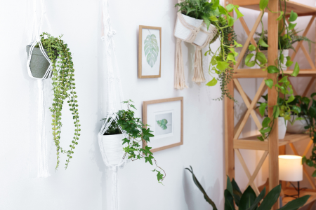 Short on floor space? Think vertical. Wall-mounted planters and tiered stands let you grow multiple plants without taking up any square footage. Hanging planters near a window add visual interest while keeping the room feeling open and airy.