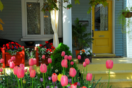 A front door with several flower pots near it, creating a welcoming impression.