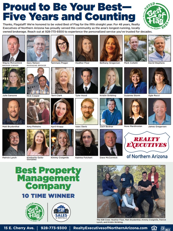 Realty Executives of Northern Arizona is honored to have been voted the Best of Flagstaff by voters through the AZ Daily Sun for 5 years in a row! And our Property Management division, 928 Rentals, has now been voted Best of Flagstaff a whopping 10 times!