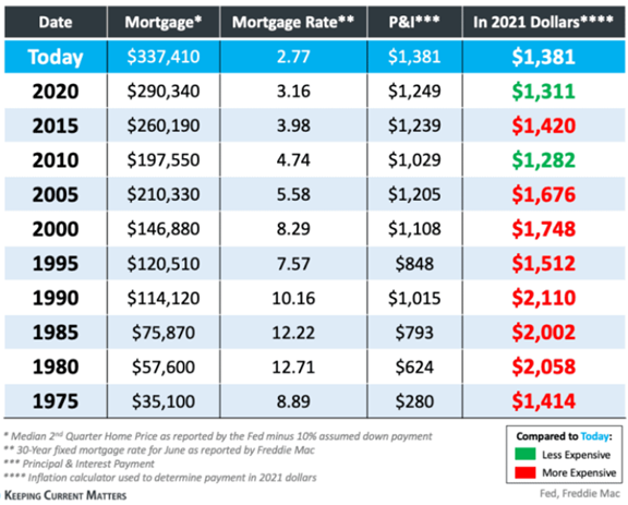 Let’s look back at the cost of a home over the last five decades and adjust it for inflation by converting that cost to 2021 dollars. Here’s the methodology for each data point of the table below: