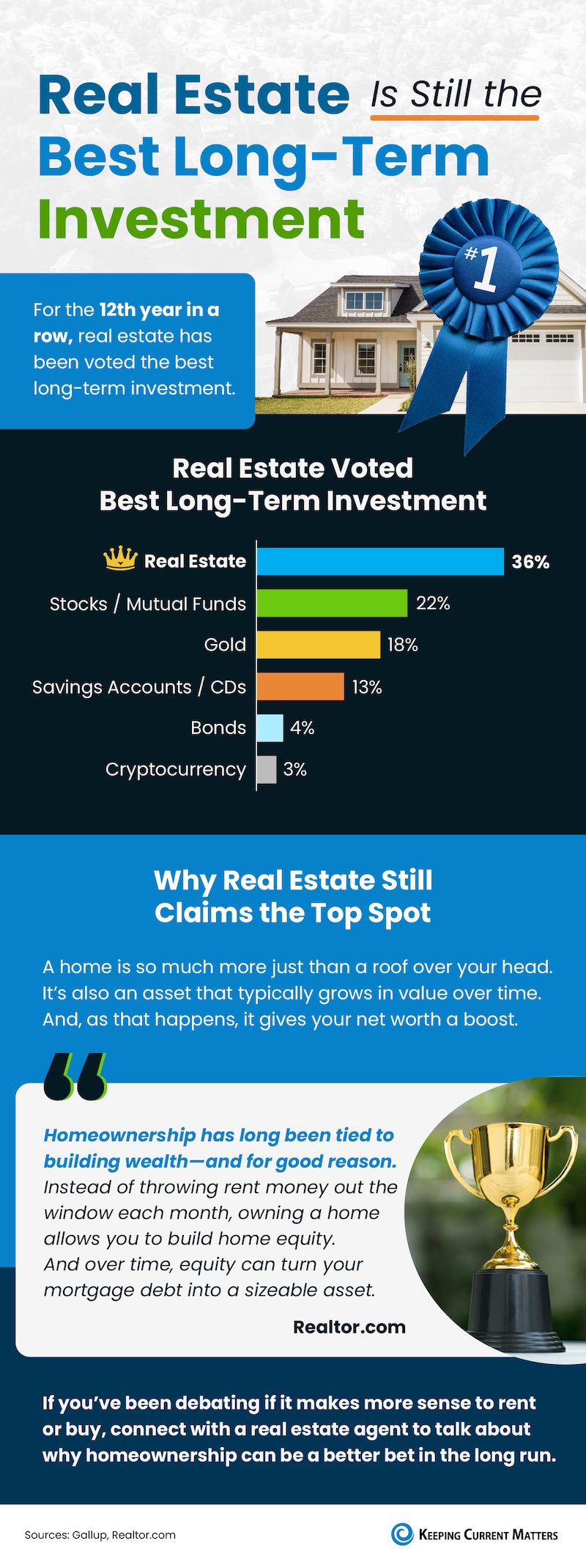- According to a recent poll from Gallup, real estate has been voted the best long-term investment for twelve straight years.