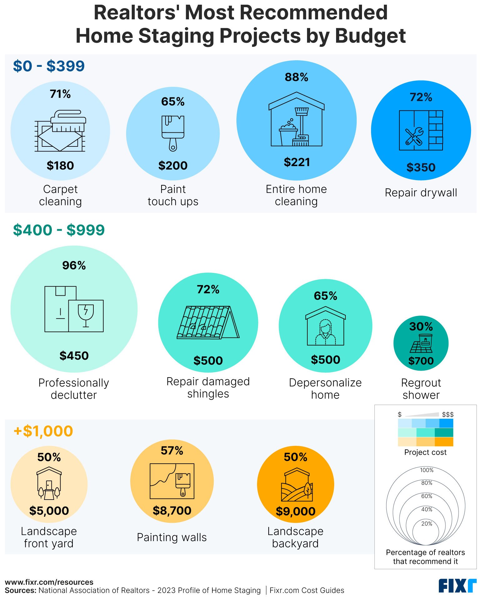 That’s why we’ve compiled a list of the home staging projects real estate professionals recommend before placing your home on the market. We’ve organized these projects by cost, so you can prioritize what best fits your budget. Using data from the National Association of Realtors (NAR) Profile of Home Staging 2023 and the latest costs from Fixr.com cost guides, you can make an informed decision about how to best prepare your home for selling.