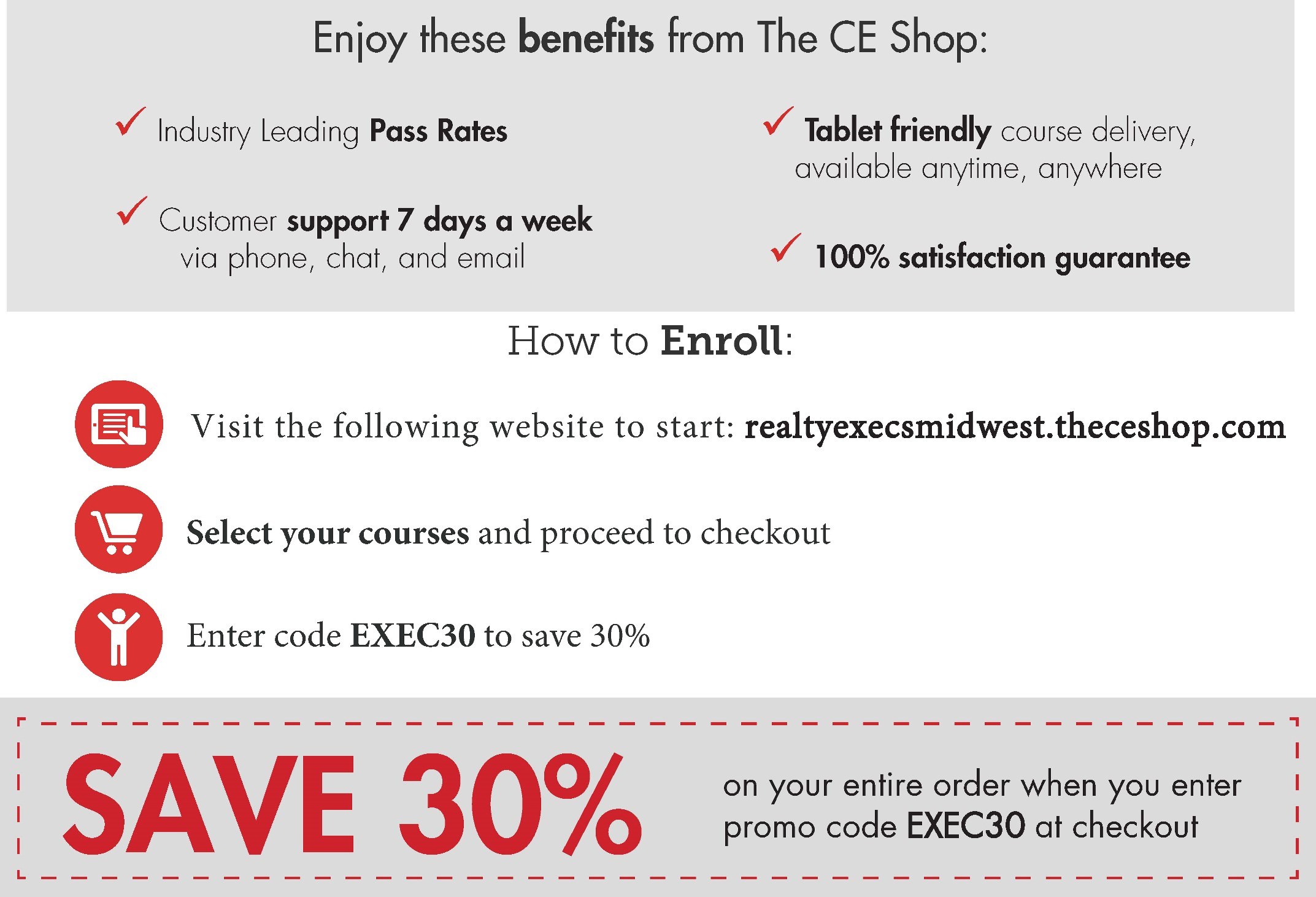 Realty Executives Midwest has partnered with The CE Shop, the leader in online real estate education, to provide you with the highest quality Pre-Licensing, Post-Licensing and Continuing Education courses. These are state-approved, self-paced courses that you can take in the comfort of your own home or anywhere you have internet access.